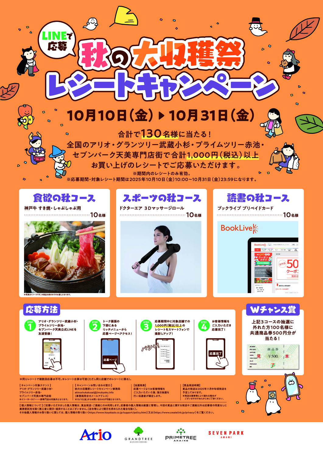 セブンパーク天美専門店街で合計1,000円(税込)以上お買い上げのレシートでご応募いただけます。