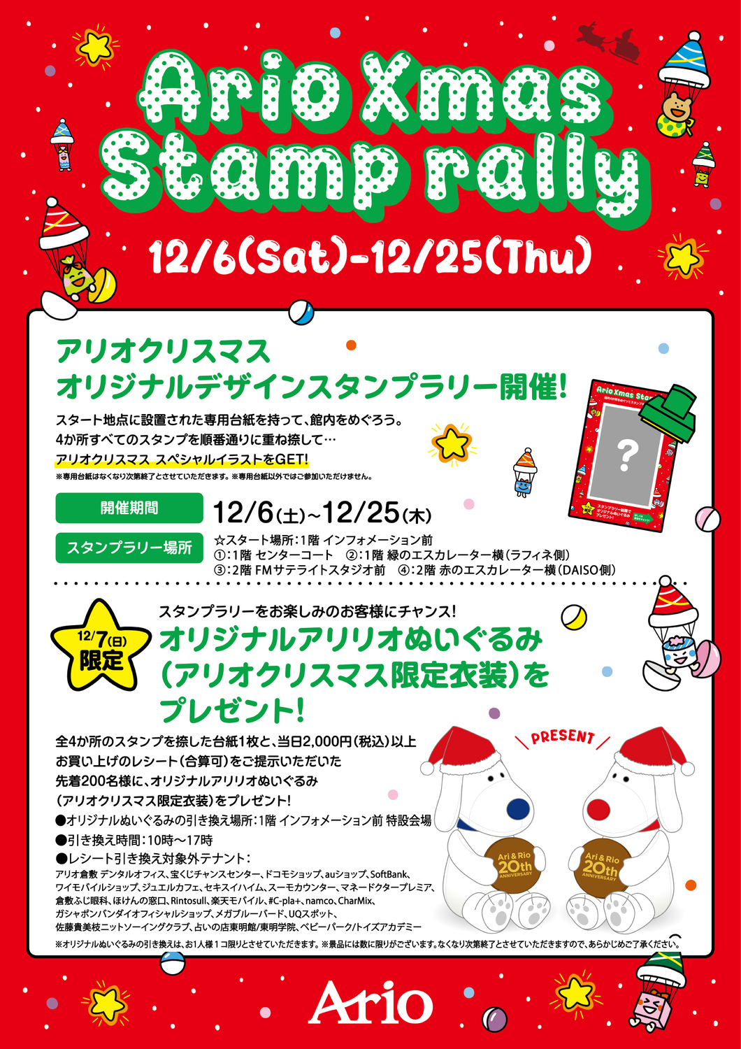 全4か所のスタンプを捺した台紙1枚と、当日2,000円(税込)以上お買い上げのレシート(合算可)をご提示いただいた先着200名様に、オリジナルアリリオぬいぐるみ(アリオクリマス限定衣装)をプレゼント!