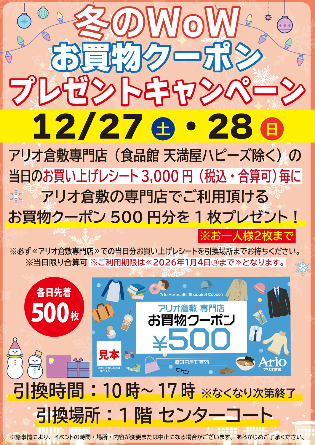 ※必ず≪アリオ倉敷専門店≫での当日分お買い上げレシートを引換場所までお持ちください。
