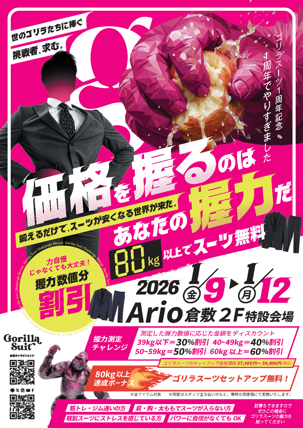 測定した握力の数値に応じて、ゴリラスーツのセットアップを 最大60%OFF でご購入いただけるほか、なんと 80kg以上達成でセットアップが無料 になる特別企画です。