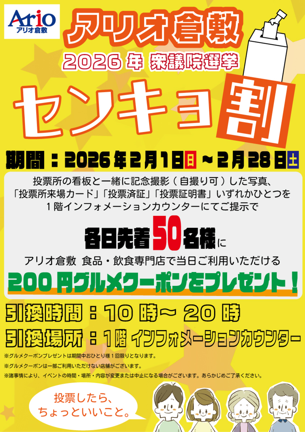2026年衆議院選挙の投票所の看板と一緒に記念撮影(自撮り可)した写真、「投票所来場カード」「投票済証」「投票証明書」いずれかひとつを1階インフォメーションカウンターにてご提示でアリオ倉敷 食品・飲食専門店で当日ご利用いただける200円グルメクーポンをプレゼント!