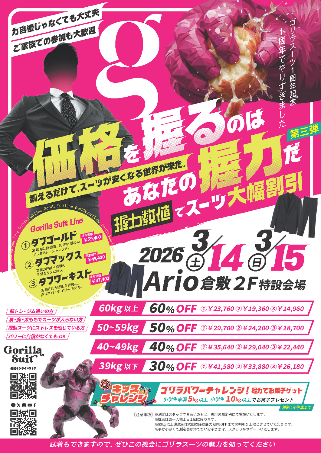測定した握力の数値に応じて、ゴリラスーツのセットアップを 最大60%OFF でご購入いただける特別企画です。