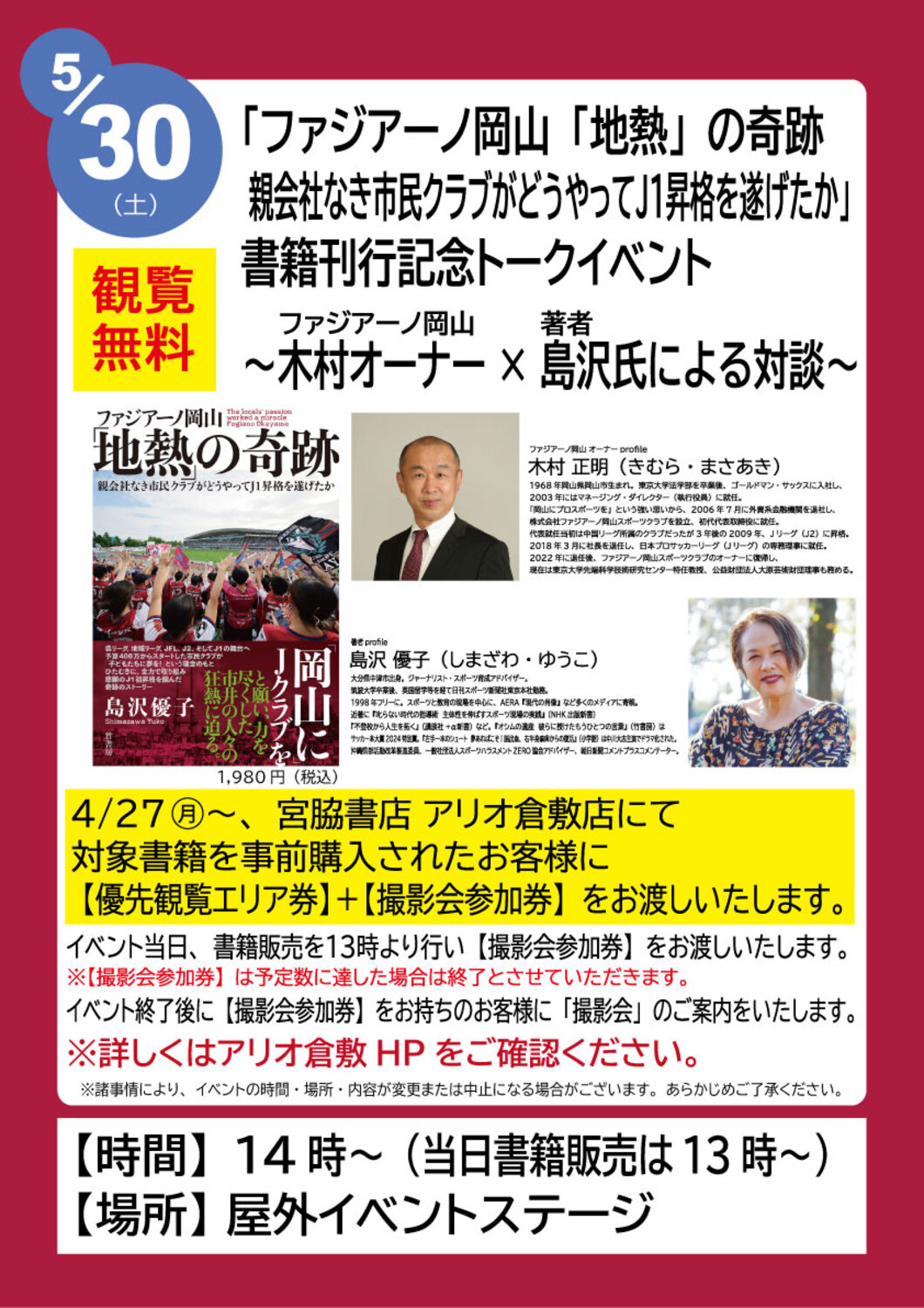 ファジアーノ岡山 木村オーナーと、著者・島沢氏による特別対談を開催いたします。