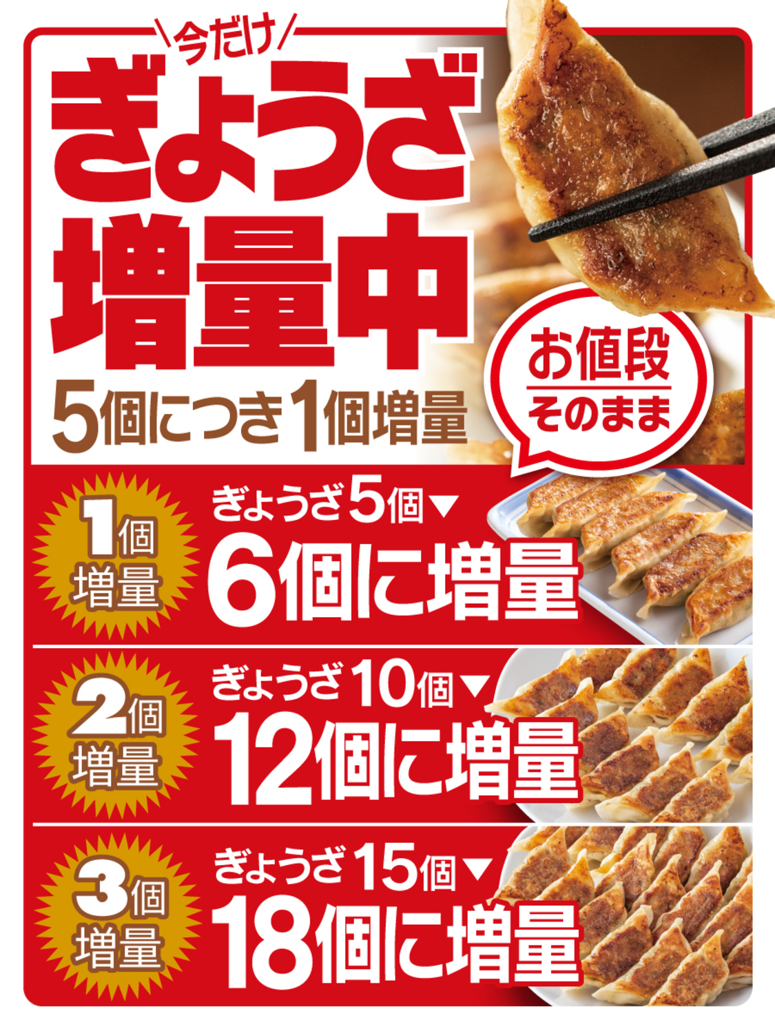 今だけのお得なぎょうざ増量キャンペーンを開催中です。