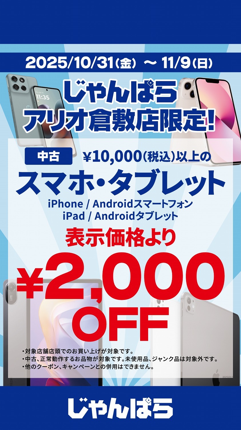 【店頭限定】中古スマートフォン、タブレット2,000円OFF!