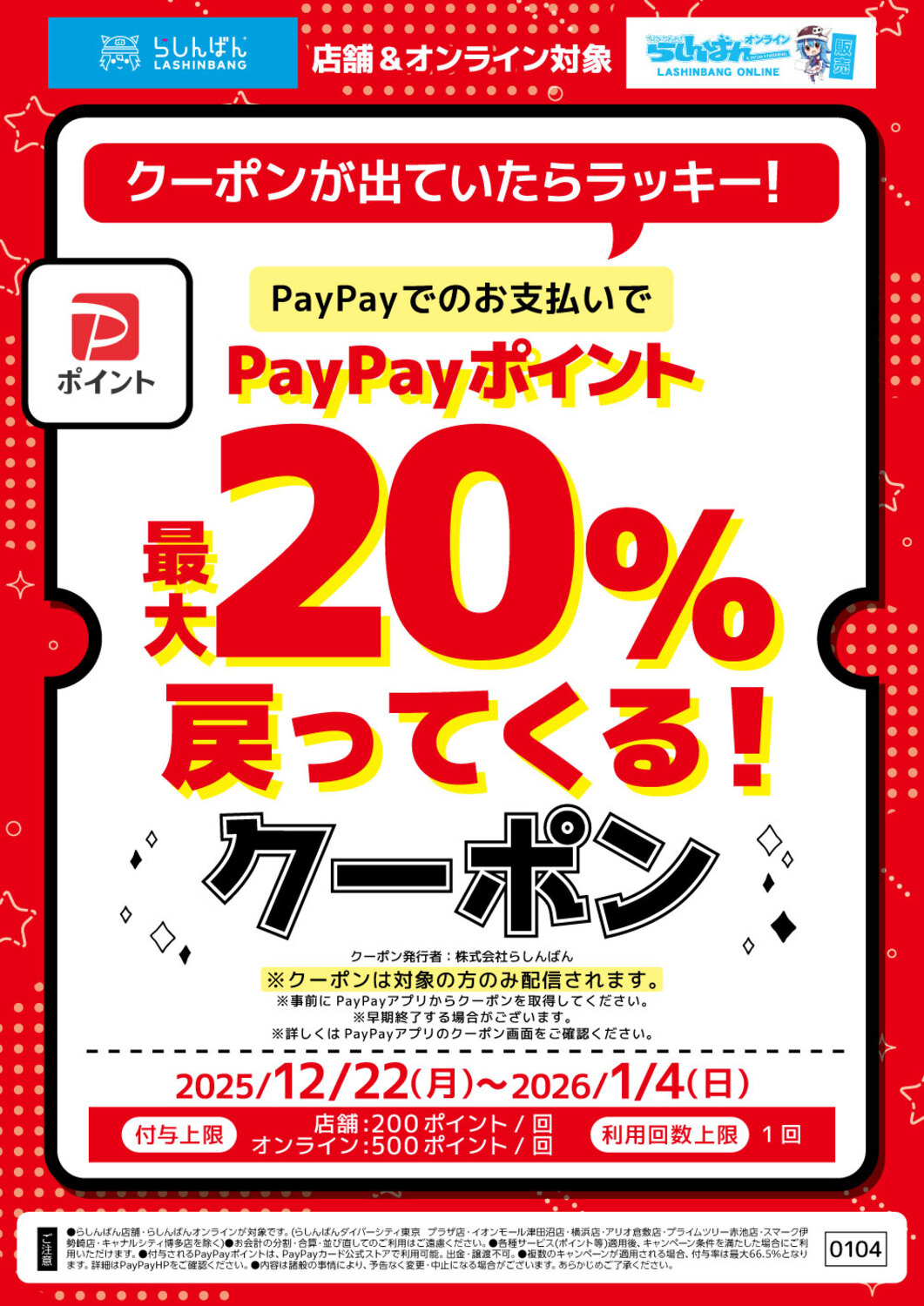 PayPayでのお支払いで、PayPayポイントが最大20%戻ってくる非常にお得なクーポンです!